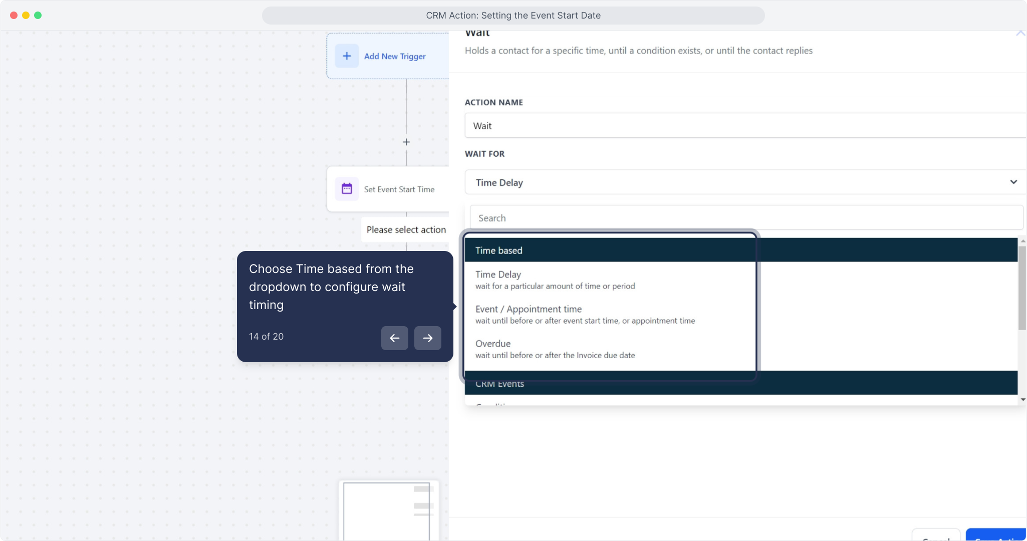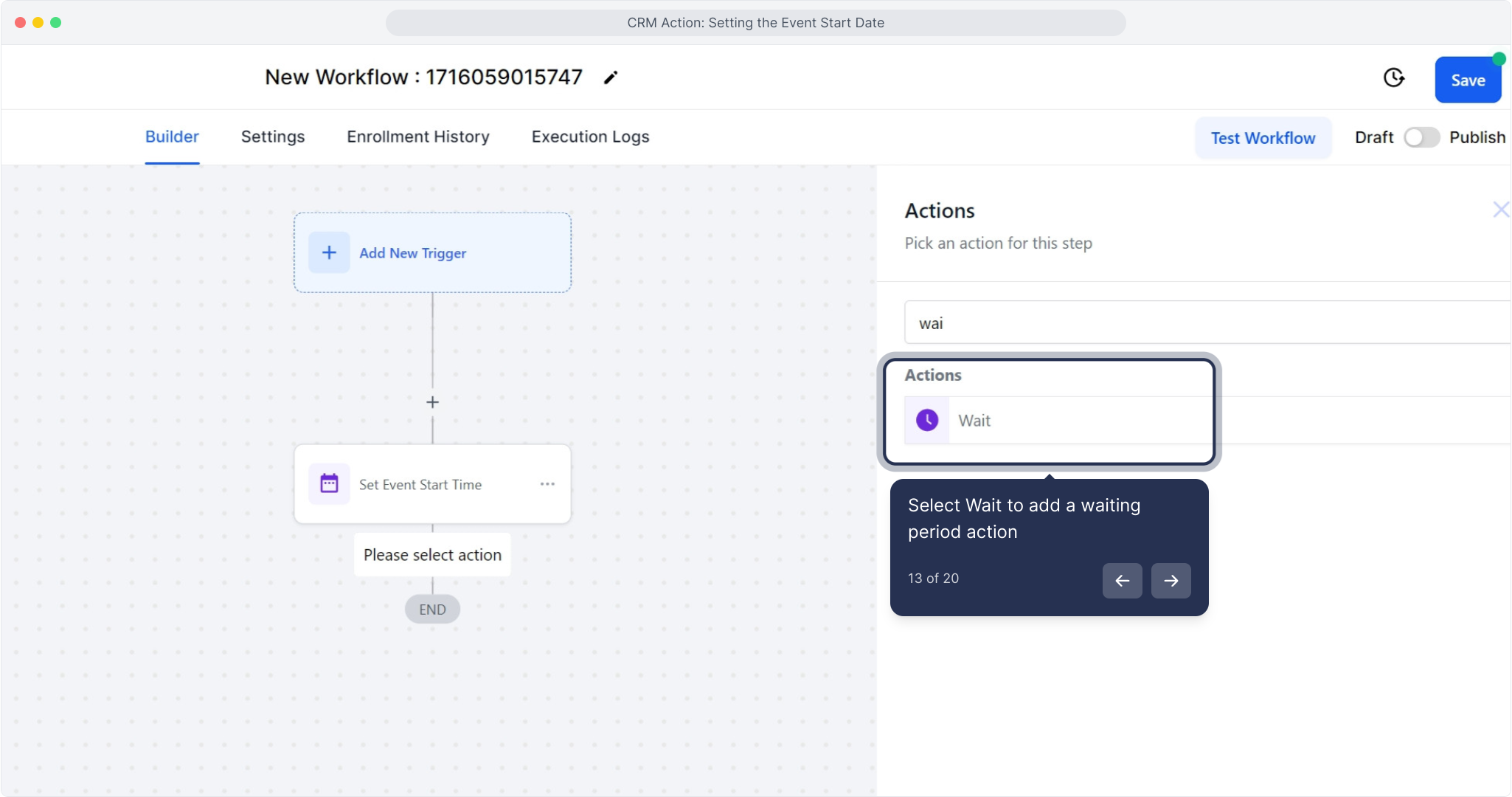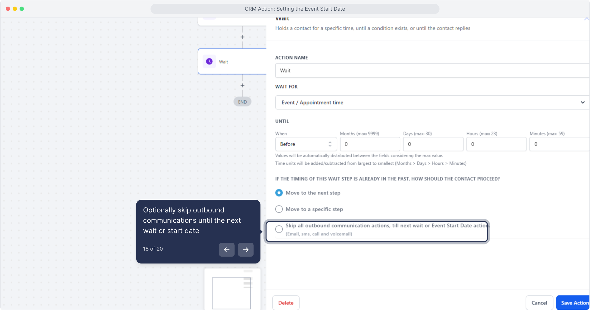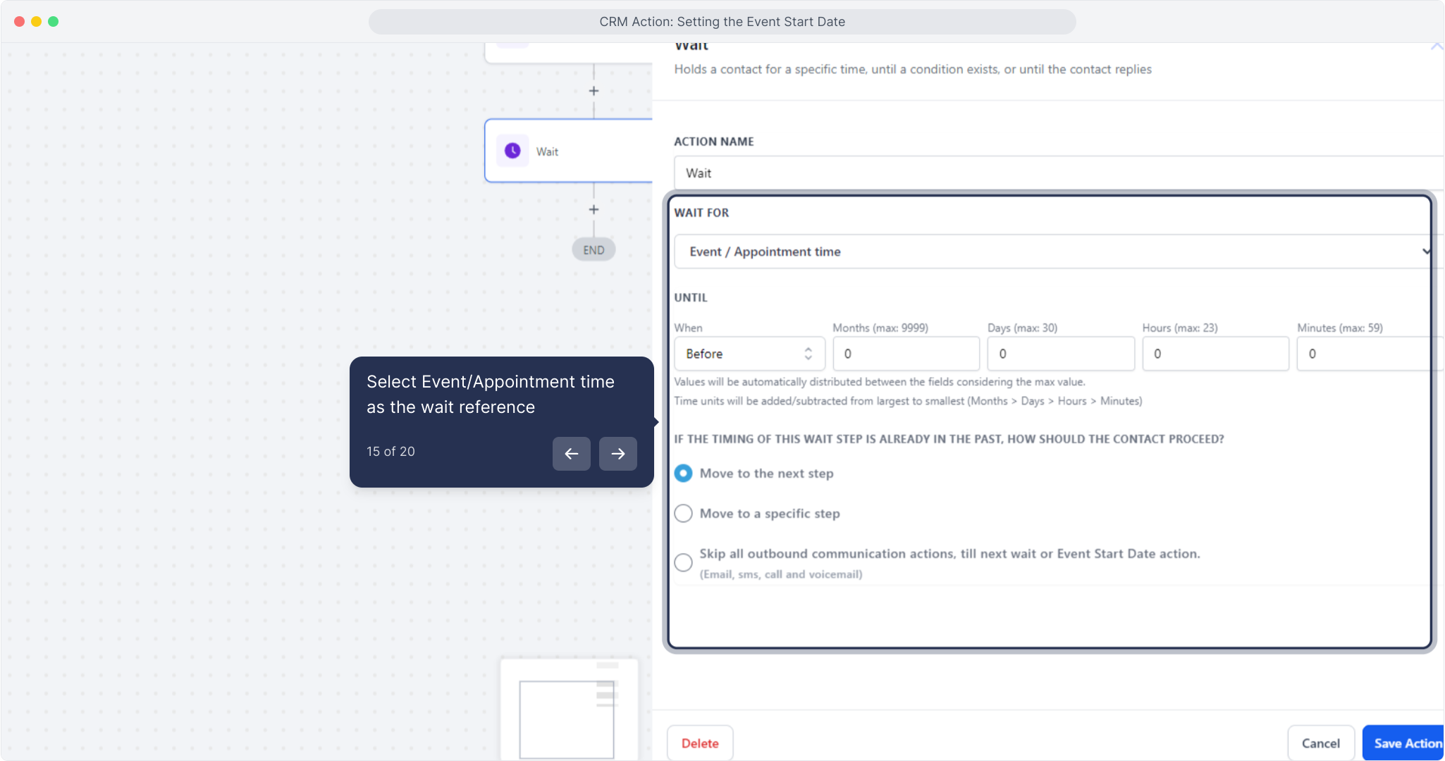 Configure this action to pause the workflow until a specific number of days/hours/minutes before or after the event start date/time.