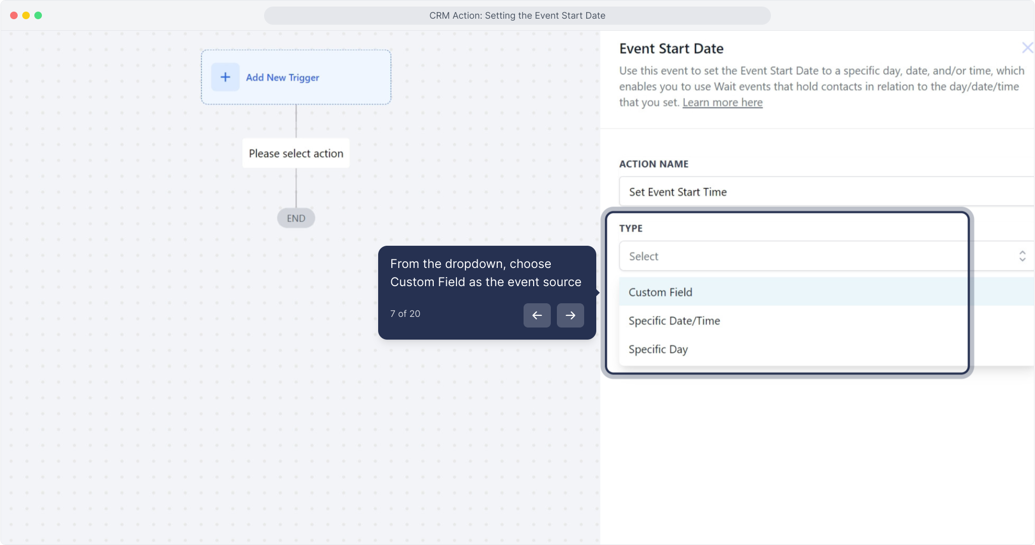 You can choose from options like Custom Field, Specific Date/Time, or Specific Day.