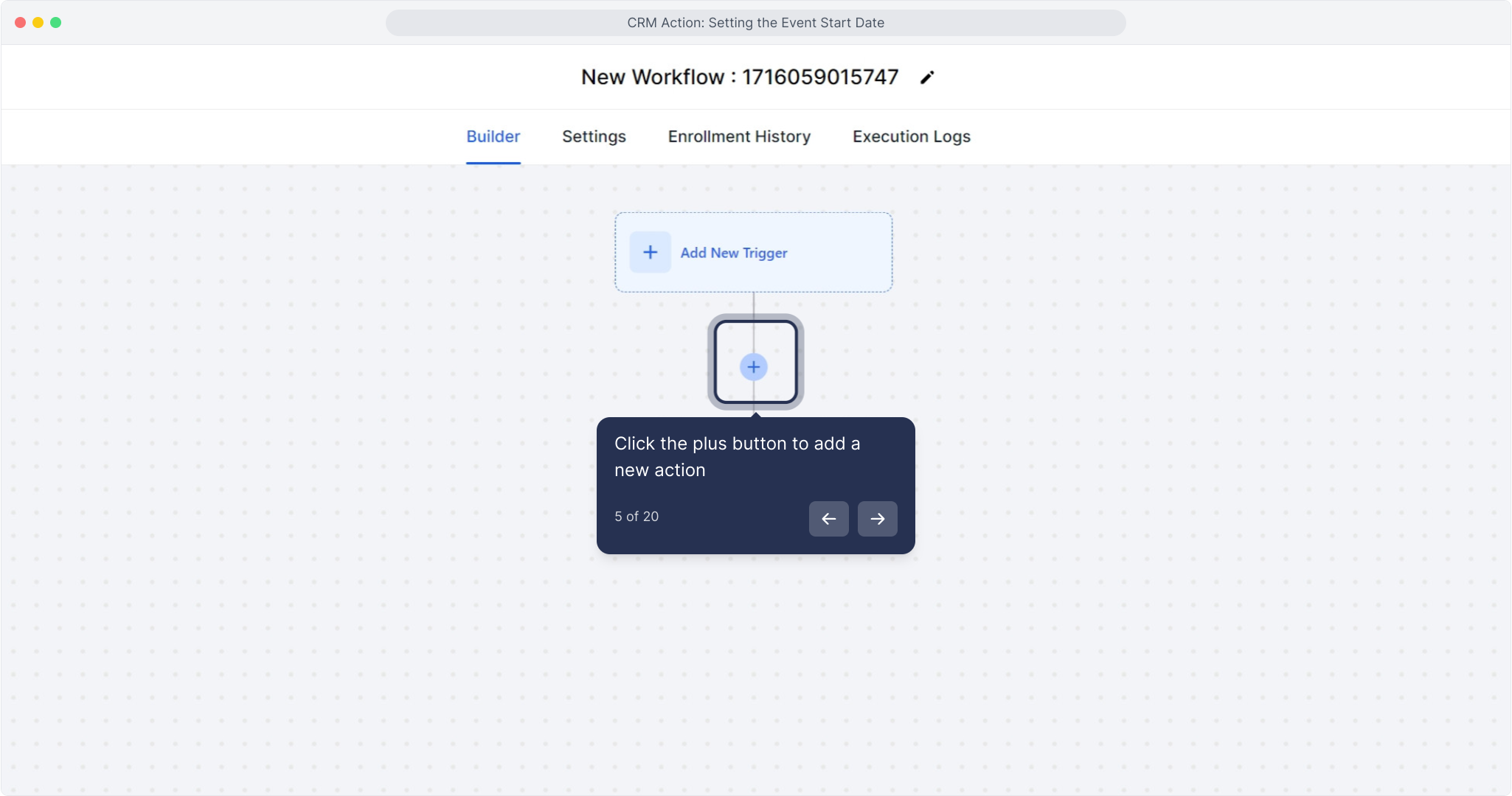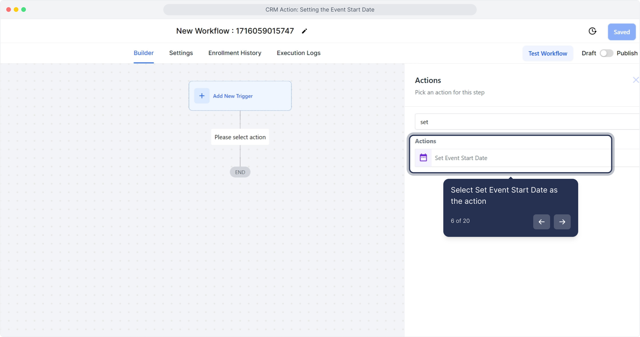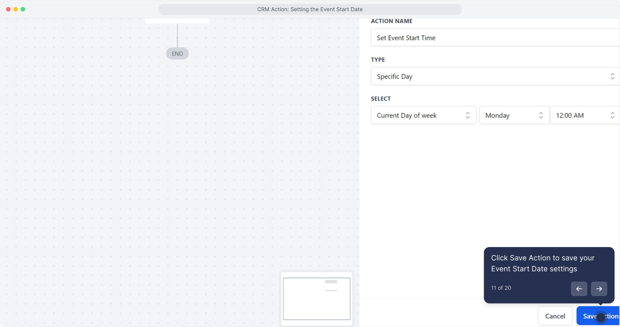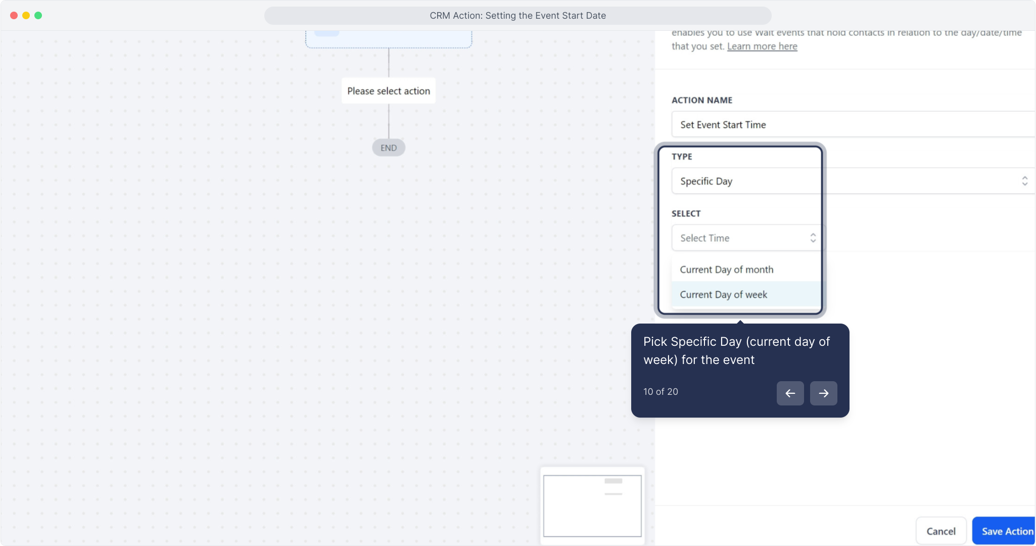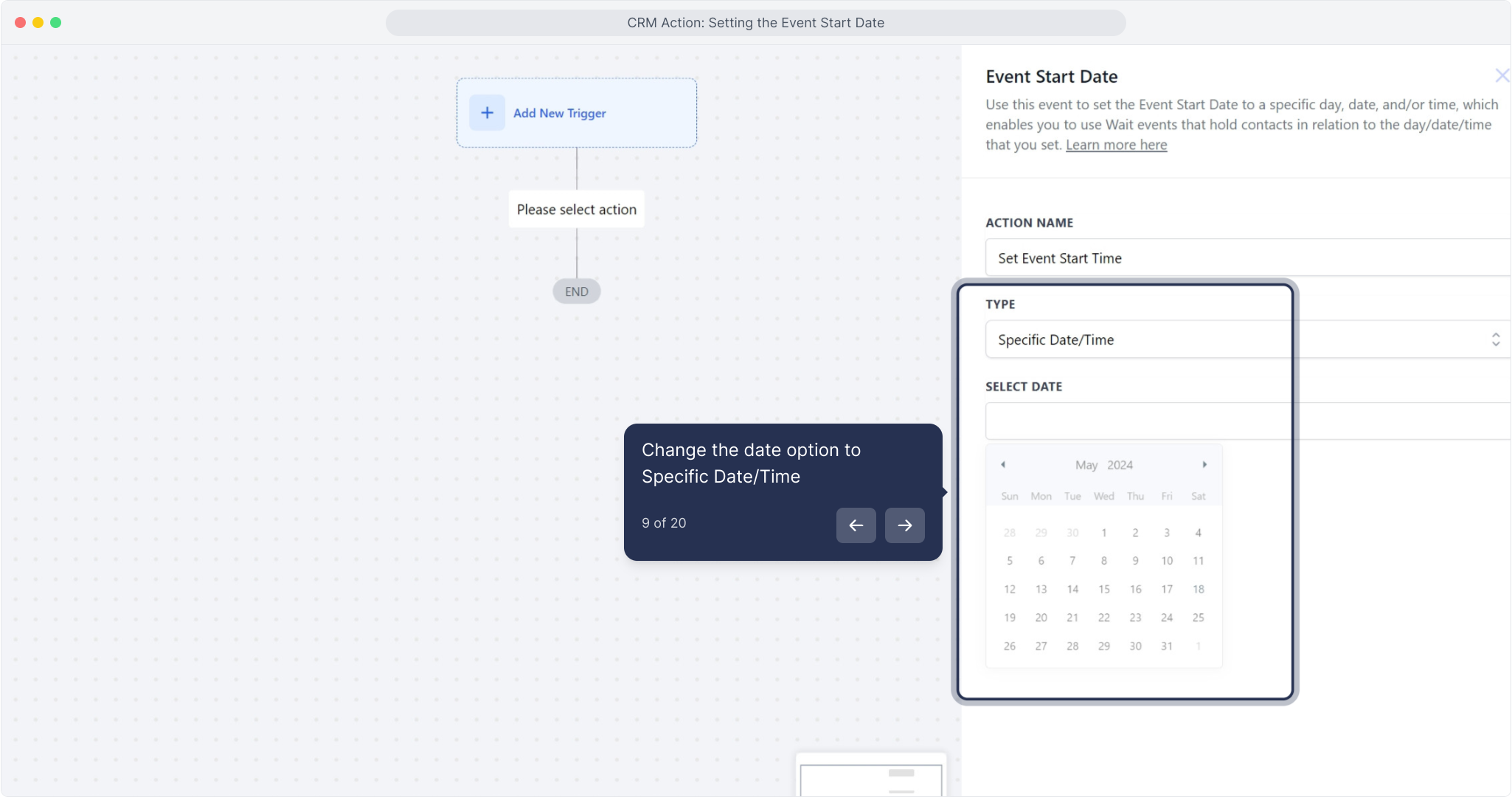 Add the 'Set Event Start Date/Time' action to your workflow and get ready to personalize it.