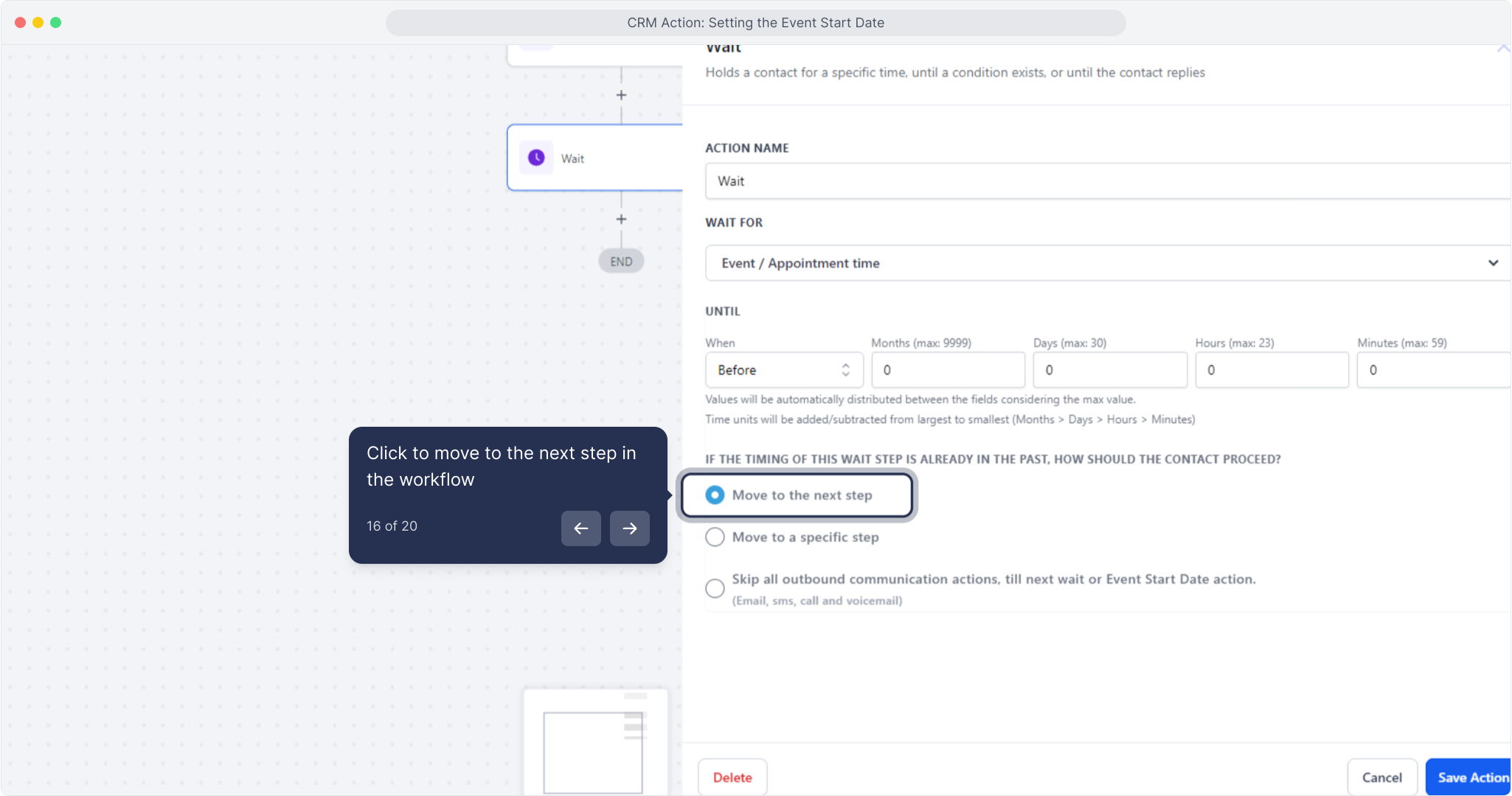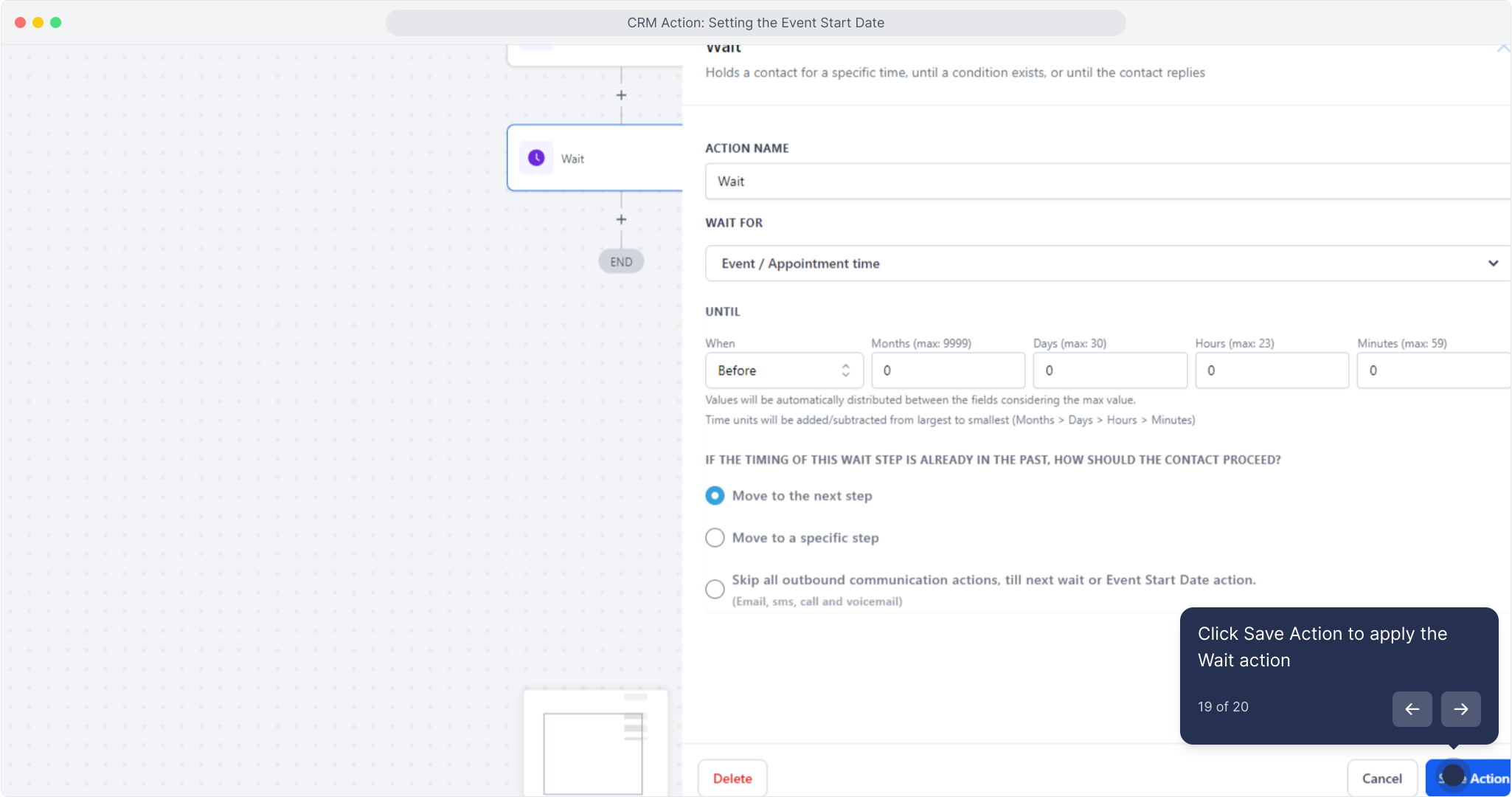 Configure the waiting period for the next action by setting the duration in months, days, hours, and minutes.