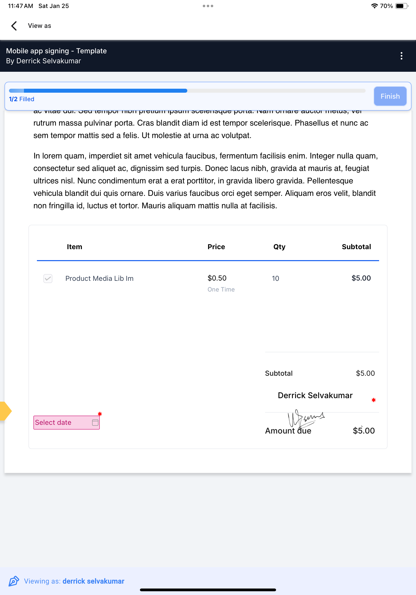 Sign document: Accept signatures using text or free-hand drawing directly on the mobile app
