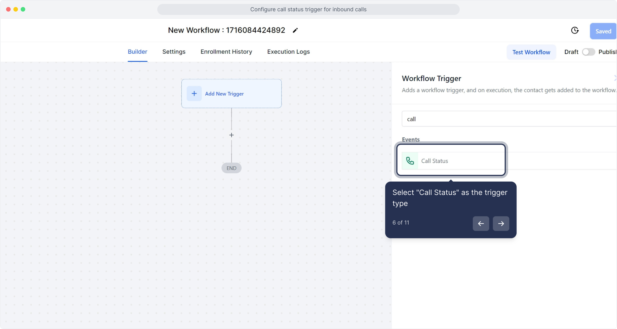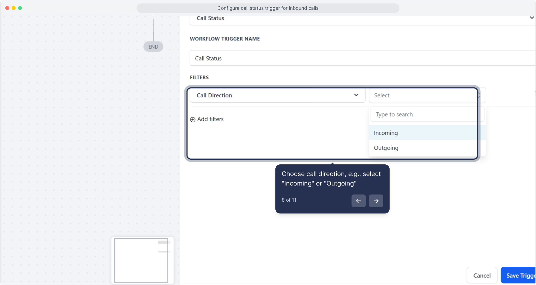 Choosing "Incoming" activates the workflow when a contact, whether a new lead or an existing customer, calls the number associated with this account.